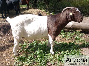 Arizona joined our herd in March 2021. I have always loved her grandsire, Dura Max so I jumped at the chance to add those genetics here. Her sire is a nice red dapple, with really nice breed character and mass (which is missing in a lot of dapple genetics). Arizona has a vertically folded ear which would DQ her in an ABGA show ring, but she is a wonderful brood doe. Great mom, easy kiddings!