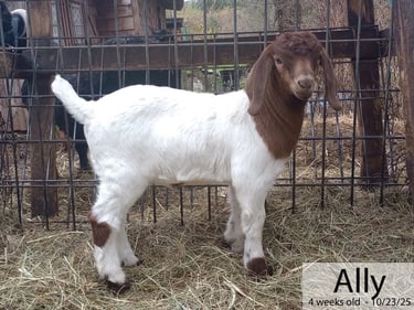 Ash comes to us from Pond Meadow Farm in CT. Not only is this girl just the sweetest, she is also a fantastic mother! Her kids are beautiful and grow great! She is our herd-queen and does a wonderful job at it. She has influenced our herd greatly, especially through her son, Buffalo. We used Buffalo heavily for multiple breeding seasons.