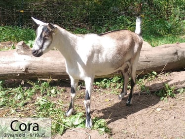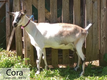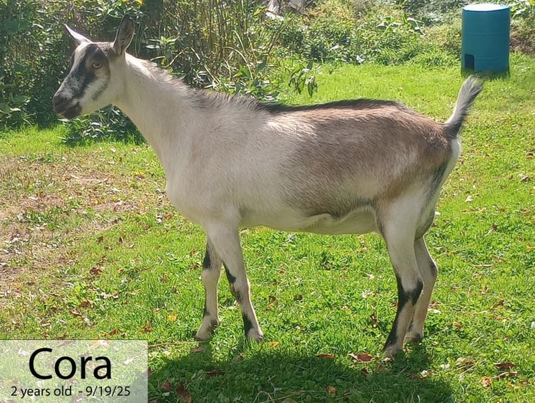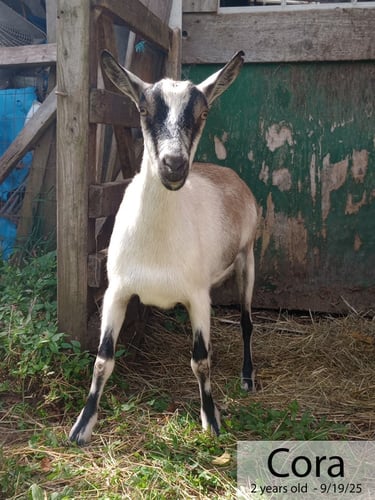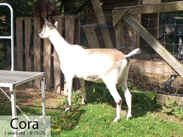 We acquired Cora from some friends who were getting out of goats and wanted her to go to a good home. I wasn't really in the market for another dairy doe, but thought she might be a fun cross with our Boers. I do love a good percentage! She seems to be from some very nice genetics, though I'd had a difficult time getting any pictures of her parents or grandparents. Either way, she is displaying very nice genetics in her phenotype!
