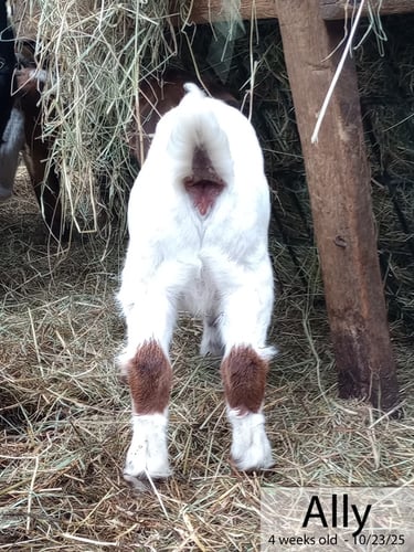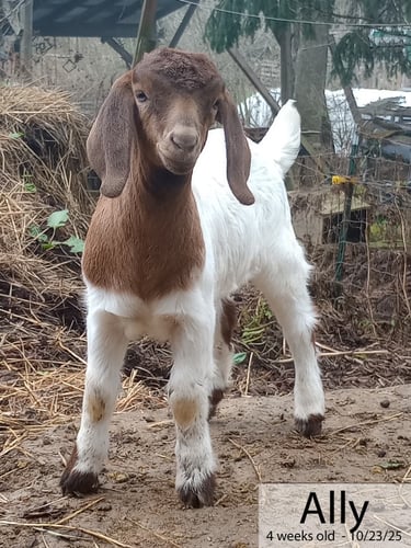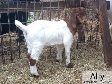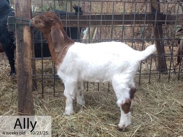 Ash's traditional Fullblood doeling, Ally, will be available, if the handful of people on my list pass on her. Sassy and Myrtle should have some availability out of their kids as well. See Breeding Page for upcoming kids/breedings.