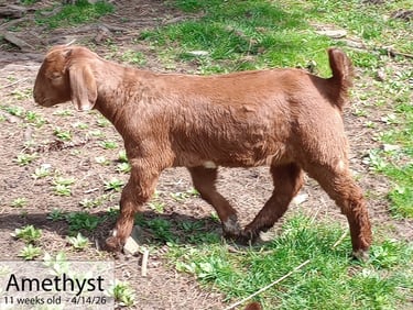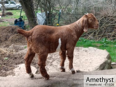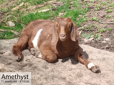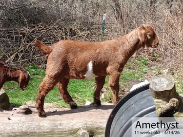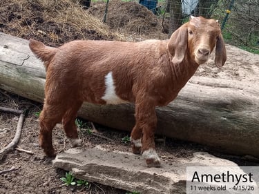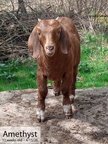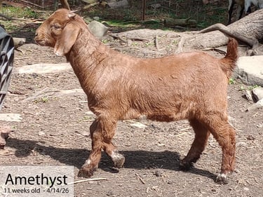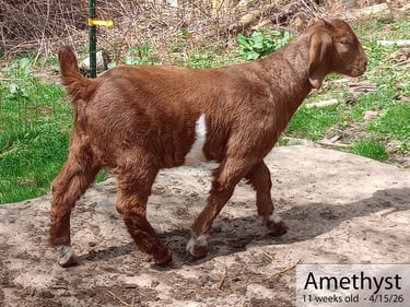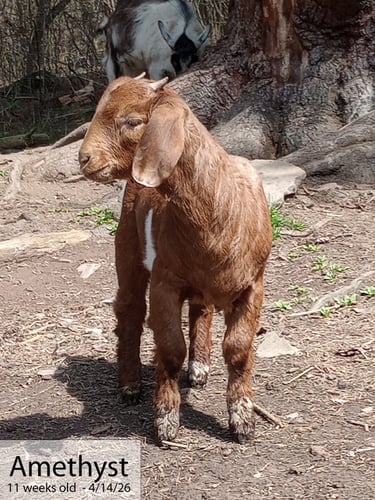Amethyst is out of one of our top does, Emmy. If you're looking for a hardy, maternal, productive doe, Amethyst could fit the bill! She does have a questionable/split teat on one side that may grow out to be a D3 or may be an A5. She should feed kids fine and be a stellar brood doe, but that teat structure may keep her from the show ring.