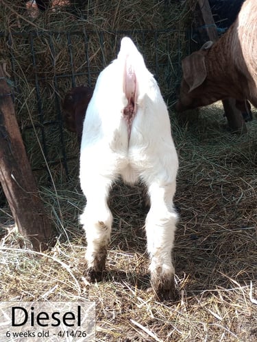 Myrtle is a darn good doe. She kidded without issue in November '23 as a first timer. She had beautiful buck/doe twins. Unfortunately, we lost the doeling early on, but Myrtle has done a fantastic job raising her buckling. She has a very good udder and milk production. She is friendly and is going to be a massive doe like her dam. She's not one that I want to sell, but I have to cut numbers. She weaned her buckling and is putting the weight back on nicely. She's almost ready to breed back. She could be sold as exposed, if you'd like Fall kids. You can choose the buck (any 3 of our breeding bucks are unrelated, so take your pick! Percy, Buffalo or Ranger)