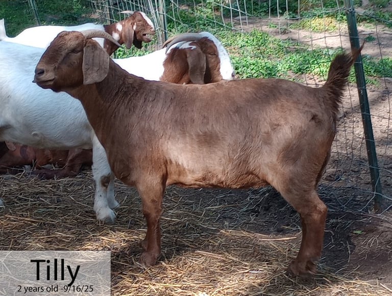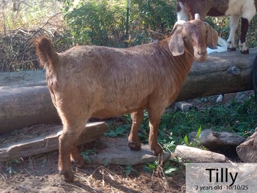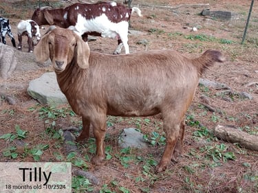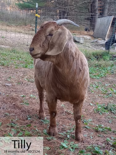 Tilly is descended from our very first goat, Dahlia. She's got a lot of solid genetics behind her, too. I've really enjoyed watching her grow. Tilly got pregnant easily and carried her kid to full-term. Unfortunately nature is not always easy. Her single, 11lb buck kid presented with his head back and despite her seeming to have ample room to get him through, I had to work for two hours to get him out. Unfortunately by the time I was able to get him maneuvered around, he did not survive the process. The BRIGHT side of the deal was that Tilly survived and I was able to milk her! She should do fine next year!