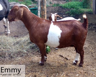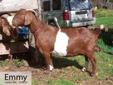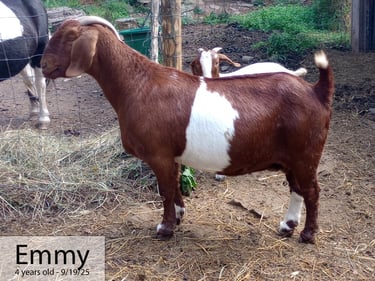 Oh Emmy. This goofy doe is likely one that will greet you, if you ever visit. I think she thinks that she was a bottle baby (though a bottle never touched her lips). She is an excellent mama and pretty, to-boot! She even allowed her twin sister's doeling to nurse from her.