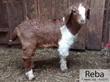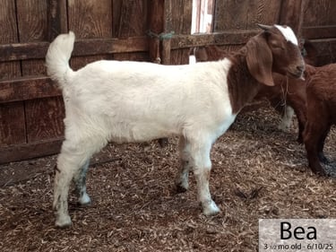 I love the thick, meatiness of this doe, but yet still has some femininity! She should mature to be a large framed doe. She kidded for the first time in 2025 and is a great mom with a lovely udder! 2 functioning teats on each side is my favorite!